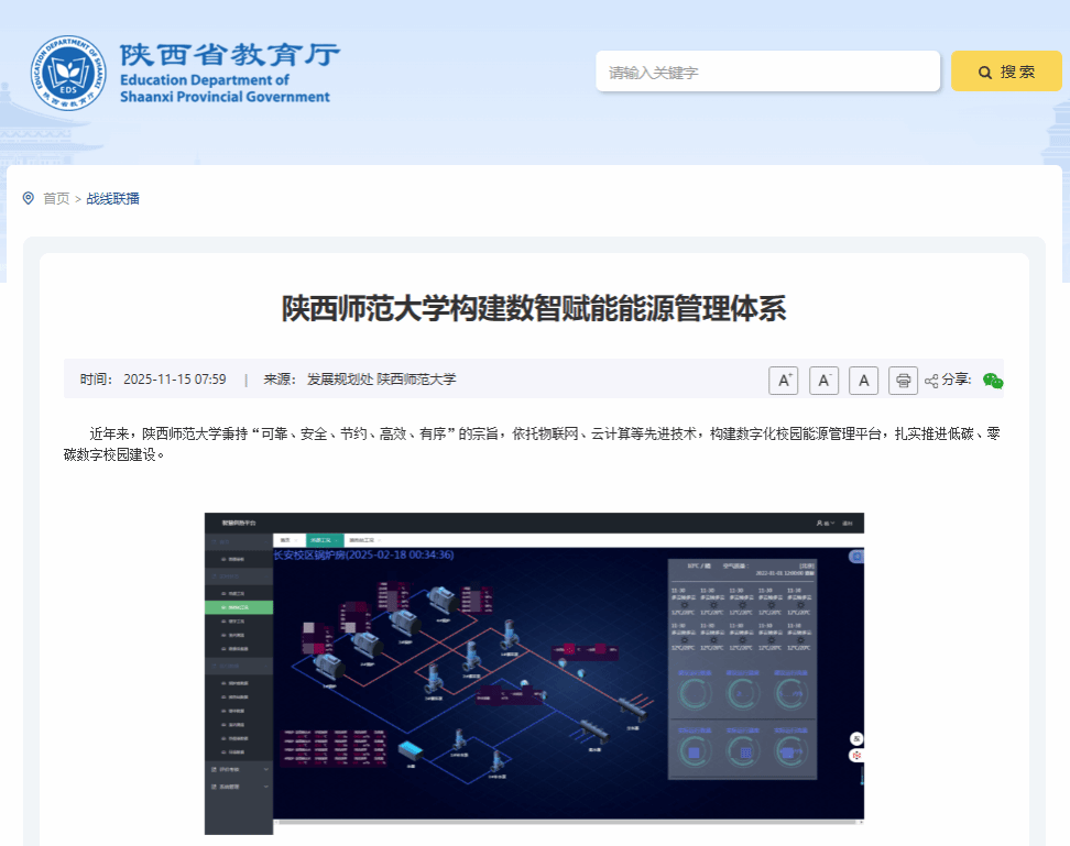 近日,陕西省教育厅官方网站以“陕西师范大学构建数智赋能能源管理体系”为题,推介了我校数智化赋能能源管理体系建设工作。文章从智慧供暖、智慧供电、智慧供水、地下管线、智慧路灯和空调智控等方面,介绍了我校在能源管理数智化建设情况及取得的成效。